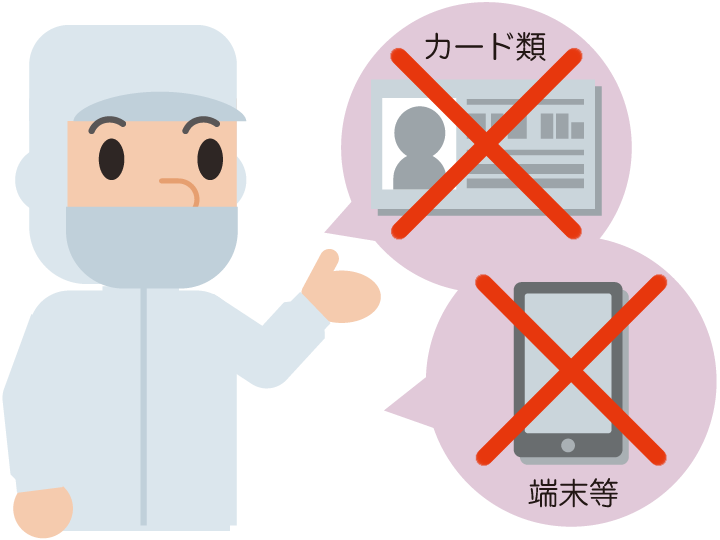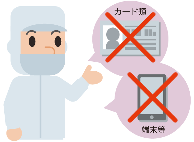 フードディフェンスを正しく実行するために、不要物の持込みの無いよう完全ポケットレスの仕組みが必要です。