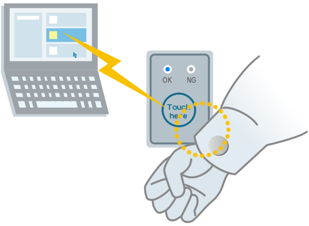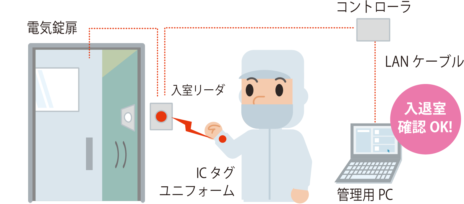 同時に管理用PCへと入室の時刻やユニフォームに関連づけられた作業員の情報が記録されます。